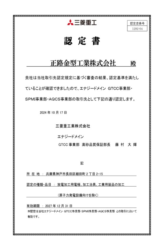 品質保証認定書