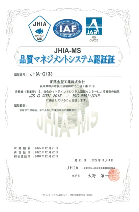 ISO9001品質マネジメントシステム認証証